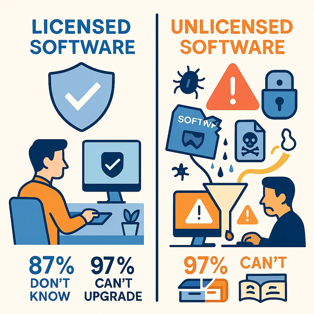 87% din patroni nu stiu ca folosirea de software ilegal ii face si mai vulnerabili la virusi. Peste jumatate dintre IMM-uri nu stiu sigur daca programele de calculator pe care le folosesc sunt licentiate in totalitate.